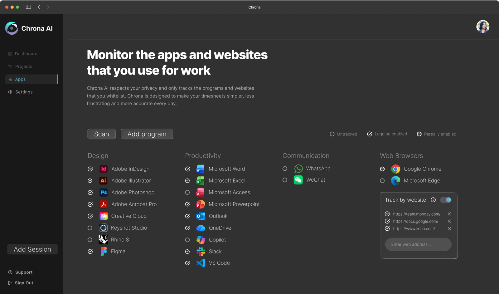 A system that observes activity creates immediate discomfort if users don’t understand what’s being watched. Rather than tracking everything by default, Chrona requires users to explicitly choose which applications and domains are included.