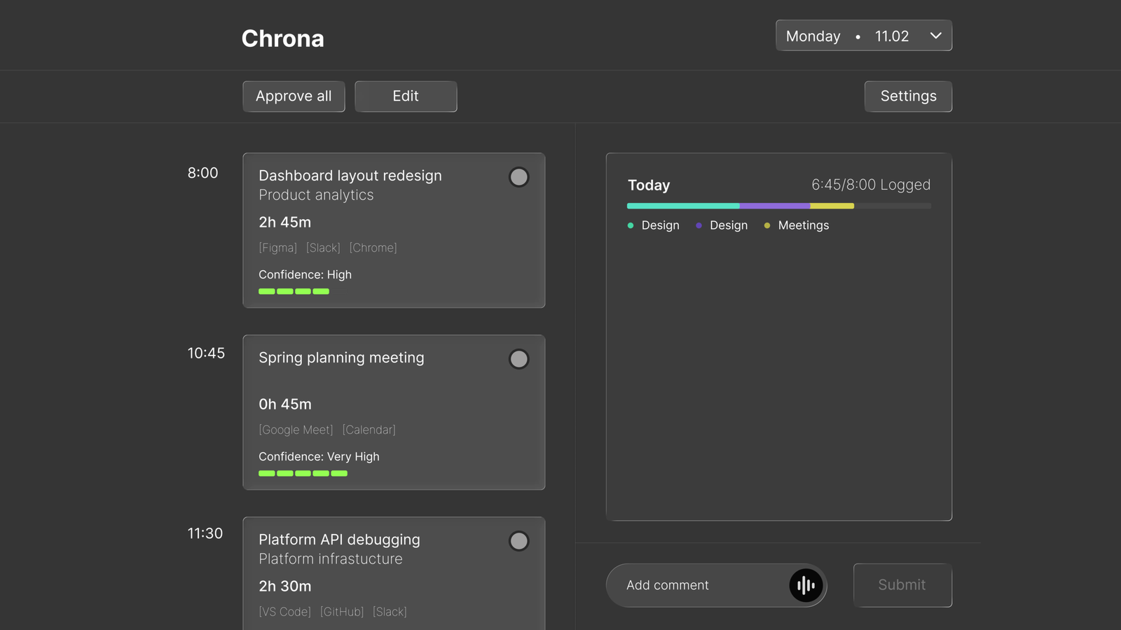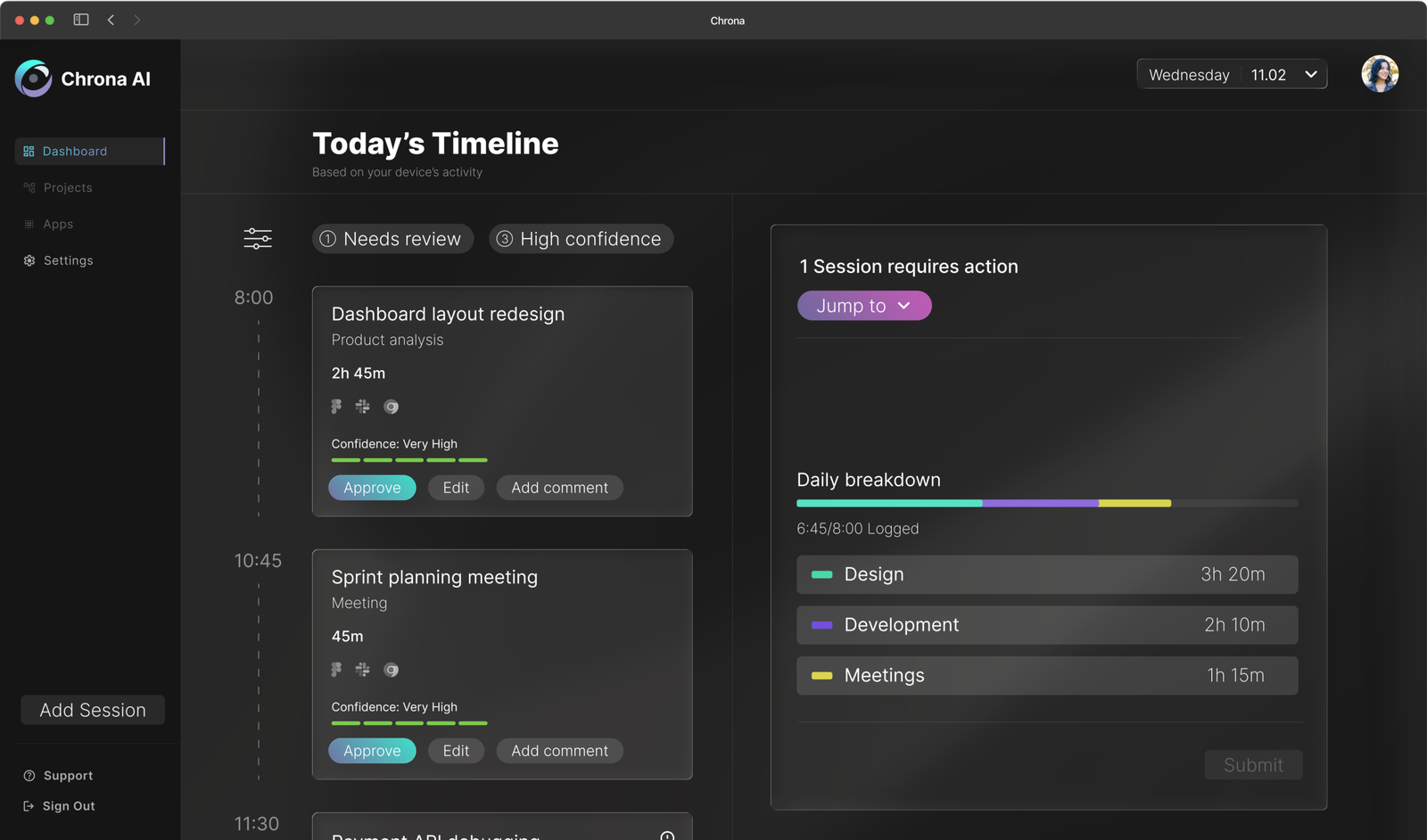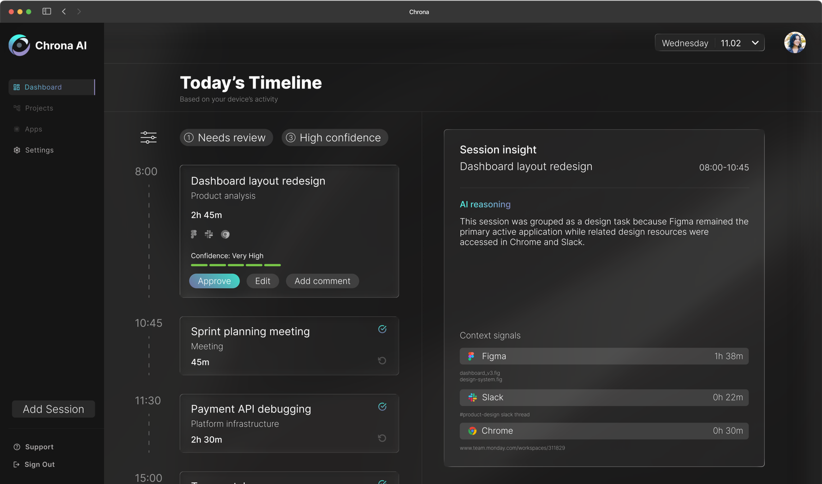 You open Chrona and your day is already there, sessions grouped, durations calculated, tasks inferred from the tools you were actually using. Nothing to fill in. Everything to review.