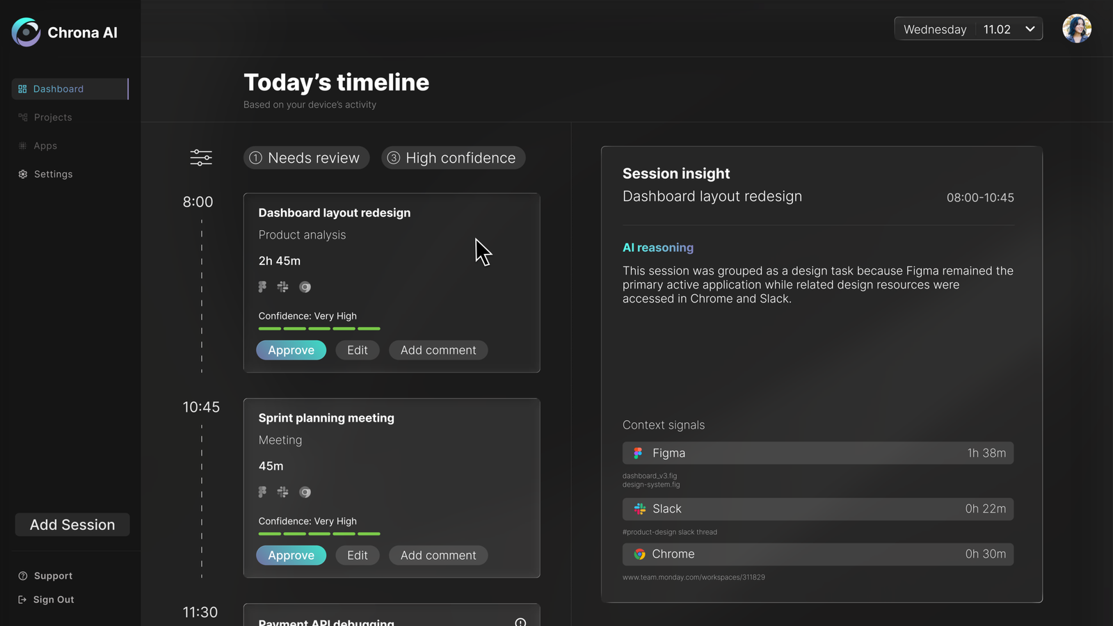 Every decision Chrona makes is explainable. Hovering on any session opens a full breakdown of the signals that shaped it – which apps were active, which files were open, how long each contributed. If the system gets something wrong, users can see exactly why and correct it immediately.