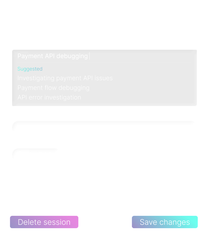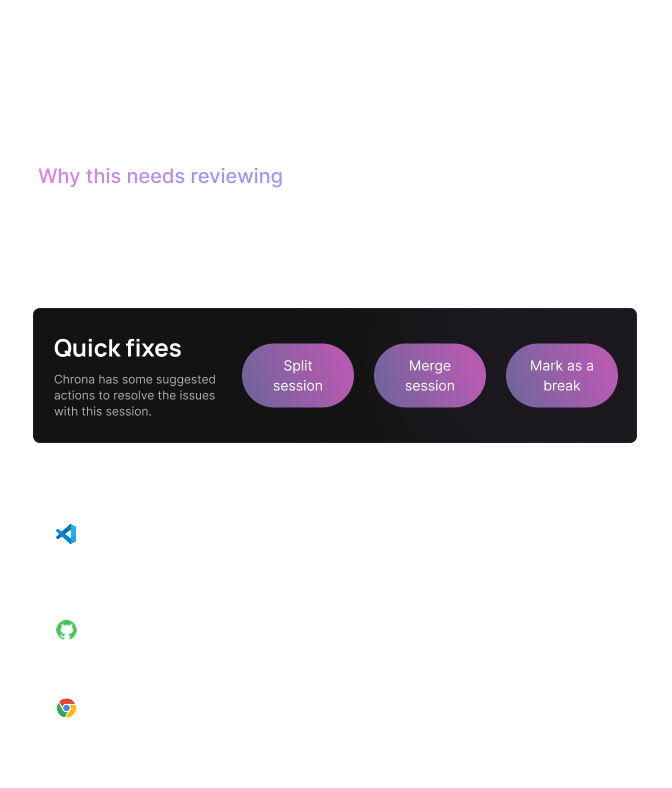 When Chrona flags a session, it doesn’t just identify the problem; it suggests how to fix it. A diagnostic panel breaks down exactly why the session needs attention, and quick actions handle the most common resolutions in a single click. For anything more complex, the full edit view surfaces AI-suggested titles, categories, and task names inferred from your project management tools and recent activity.